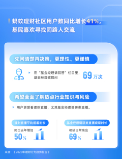 《报告》显示,实现股、债基配置的“金选”用户中,债基占比一半以上的求稳型用户占40%,同比去年高出3个百分点。与此同时,投资者对于投资决策也更加理性、谨慎。数据显示,2023年蚂蚁理财社区的用户数同比增长41%,在理财社区“基金经理请回答”栏目里,基金经理被提问69万次,先问清楚再投资成为基民的基本操作。理财直播的平均观看时长同比去年增加50%,其中基金经理调研类直播的观看时长较其他高出69%,体现出投资者希望全面了解热点行业知识与风险。