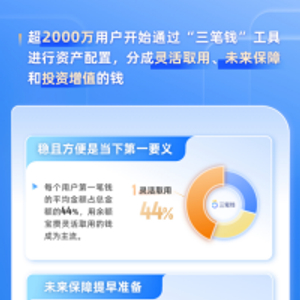 报告数据显示,有超2000万用户开始通过蚂蚁财富“三笔钱”工具进行资产配置,将钱分成灵活取用、未来保障和投资增值三部分。