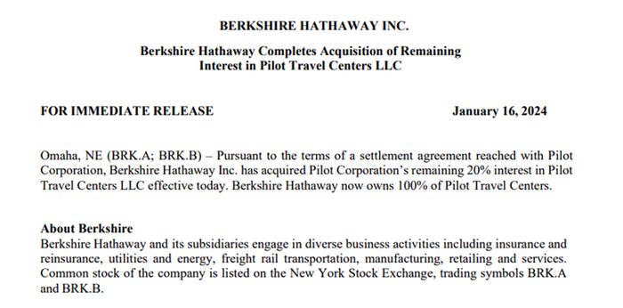 这次收购后,Pilot成为伯克希尔的全资子公司。