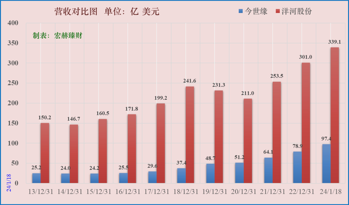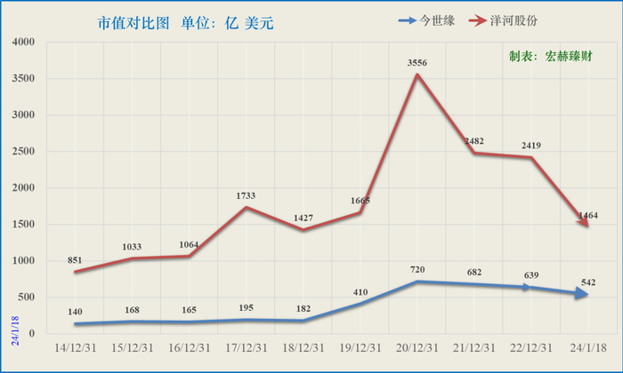当前时点,洋河股份以339亿的营收,105亿的归母净利润,得到了1464亿市值(市盈率14倍);而今世缘以97亿的营收,31亿的归母净利润,得到了542亿的市值(市盈率18倍)。