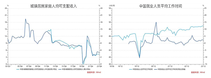 数据来源:wind,城镇居民家庭可支配收入统计周期:2003年1季度-2023年4季度,中国就业人员平均工作时间统计周期:2018年6月-2023年12月