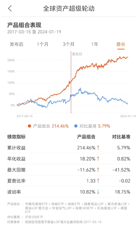 三年前我们在ETF组合宝中创建的(全球资产超级轮动)策略就是最好的案例,保持进攻的同时获得了一条更为平滑的曲线: