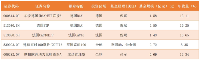 分别是跟踪德国DAX指数的德国ETF(513030),跟踪法国CAC40指数的法国CAC40ETF(513080),跟踪英国富时100指数的建信富时100指数A(539003)。