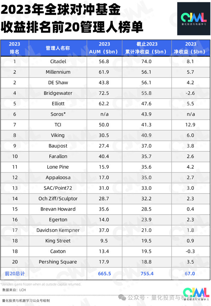 2023年,全球Top20的对冲基金为投资者赚的钱。自成立以来,他们已经为投资者赚取了7554亿美元。