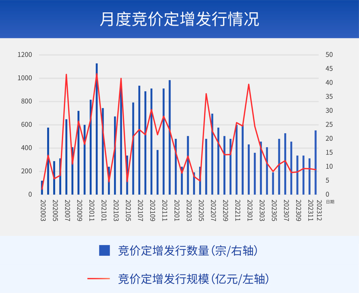 解读:据Wind数据,2023年12月竞价定增项目共23宗、融资规模逾215.59亿元,保持平稳节奏。
