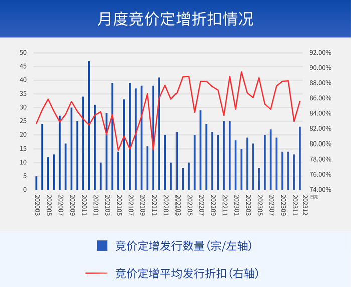 解读:已披露的Wind数据显示,2023年12月竞价定增项目发行23宗,平均折扣85.63%,较2023年中的折扣水平已有明显的回落。