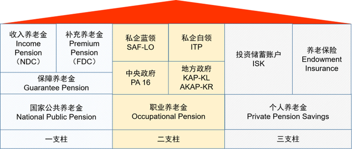 瑞典养老金制度始建于1913年,目前主要由国家公共养老金、职业养老金和私人储蓄养老金三支柱构成。其中第一支柱公共养老金包括名义账户制养老金(income pension)、实账积累制养老金(premium pension)和最低保障养老金(guarantee pension),第二支柱职业养老金根据雇主类别分为四种计划,一般以集体协议形式自动加入,第三支柱个人养老金为自愿性的私人投资储蓄或私人养老保险。详见图2。