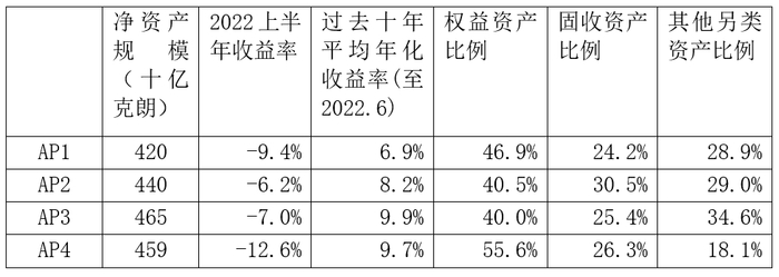 NDC账户的缴费会平均分配给四个国民养老基金(AP1、AP2、AP3、AP4)进行委托管理投资运作,给付时也是由四家平均共同支付。另外还设有第六国民养老基金(AP6)作为缓冲基金,以应对现收现付制可能出现的赤字。四个国民养老基金投向全球资产,包括股票、债券、不动产、基础设施建设、私募股权和对冲基金,投资理念践行长期主义与社会责任。投资比例规定为至少20%投向固收类资产,至多40%投向流动性较差资产。四个国民养老基金的投资收益情况见表1,各大基金基本都实现了较好的长期投资收益,这离不开全球分散化投资和对应资产投资比例限制。