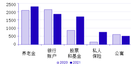 2021年,瑞典家庭金融资产中养老金资产占比最高。2021年全年,瑞典家庭金融资产净储蓄达到7340亿克朗,相较于2020年增长了990亿克朗。其中按金融工具细分,占比最高的为养老金资产,达2 320亿克朗,占31%,此处养老金资产统计口径为第一、第二支柱。跟随其后的为银行账户、股票和基金、私人保险和公寓。其中,私人保险储蓄较前年增长显著,规模达到750亿克朗。见图3。