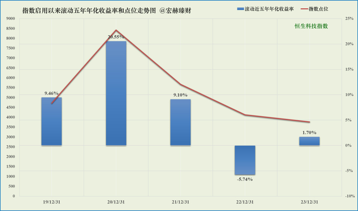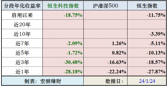 分段收益率来看,恒生科技指数几乎是启用在历史高位,近三年收益大幅落后于市场规模指数。