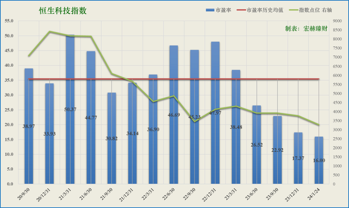 市盈率:恒生科技指数指数自2020/07/27日启用以来季度市盈率均值35.40倍,最大值为200331日的50.37倍;最小值为240124日的16.24倍。当前值16.24倍,处于历史区间的百分位:【0%】
