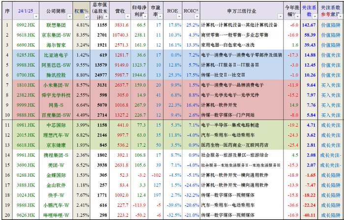 从宏赫关注系数也可看出当前市场环境下,阿里、腾讯都跌成价值属性股了。