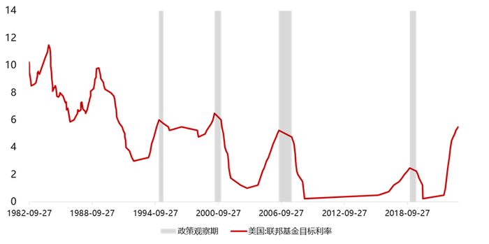 自上世纪90年代以来,美联储经历了4轮加息周期,它们有一个共同特征:在加息结束后、降息开启前,都有一段政策观察期。