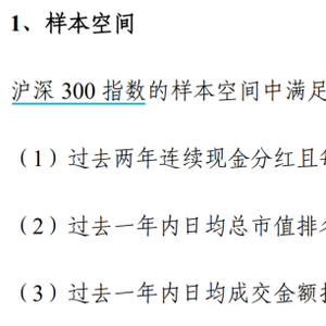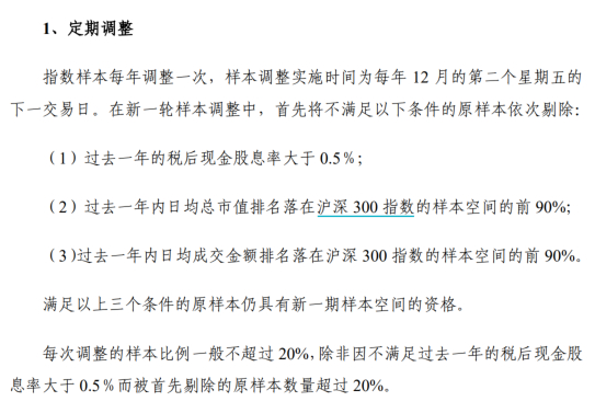 其后,对样本空间内证券过去两年的平均税后现金股息率由高到低排名,选取靠前的100只证券作为指数样本。再之后,样本每年定期调整一次。