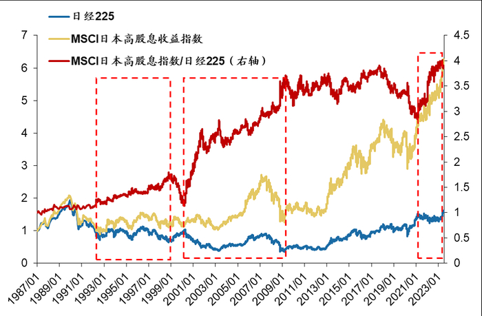 日本:高股息指数在“失去的三十年”间,三个阶段显著占优
