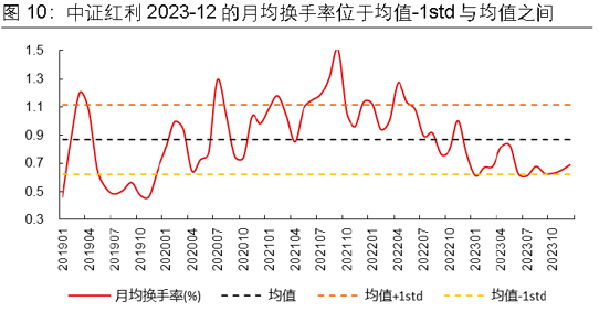 该指标在某种程度上可以反映市场交易情绪。在市场开年以来较为低迷的整体成交情况下,中证红利当前的换手率处于均值-1倍标准差和均值之间,交易情绪可能难言活跃。