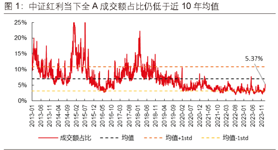 中证红利当下全A成交额占比低于近10年均值,但如果放眼近三年,中证红利当下成交额占比则居于高位。