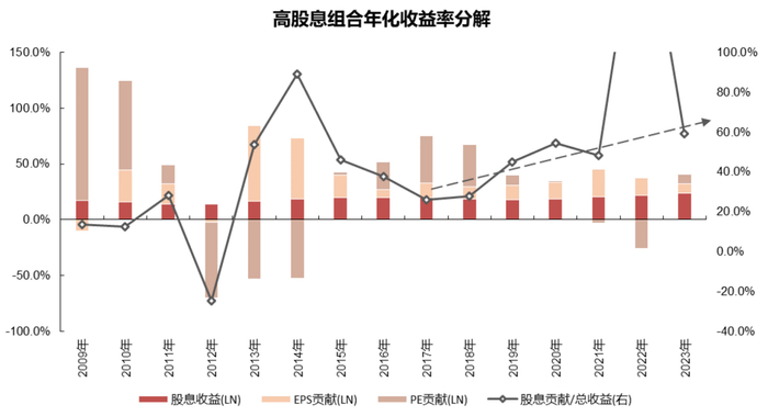 由博格提出的收益来源的三个指标,有研究对A股高股息组合自2009年以来,每年的年化收益率做了如下图所示的收益拆分,进而发现:自2017年以来,国内高股息组合对股息率的依赖度正在变强。