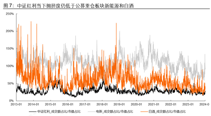 此外,研究将中证红利与过往白酒和新能源的成交额表现进行对比,认为中证红利的交易拥挤度可能并未过热。