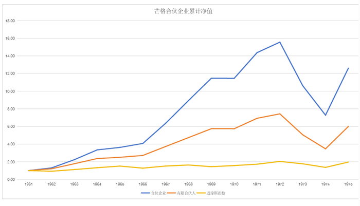 再看这张图,蓝线是芒格合伙企业的累积净值图。从1增长到15.5,又调回到7,另又回到12。到1975年时,芒格就把他的合伙企业清算掉了。