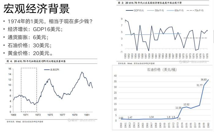 结合当时的宏观经济背景,大概从1973、1974年的时候,美国出现了通胀现象。大家可以从以下这幅图得知当时的石油价格。