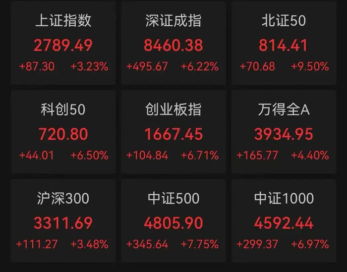 早盘低迷后,周二午后A股市场终于上演大反攻,上证指数上涨3.23%,深证成指、创业板指、创业50指数、中证1000指数涨超6%,中证500指数上涨7.75%,科创100、北证50指数大涨超过9.5%。两市3800余股上涨,个股涨幅中位数3.59%,成交额放大至9263亿元,北向资金净流入126.05亿元。(来源:Wind)