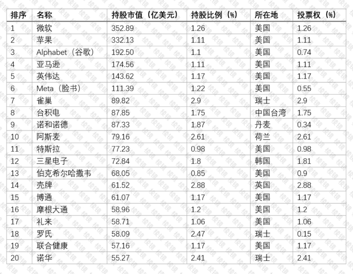 2023年12月31日,GPFG持仓市值前20名的股票(以美元计),持股比例指的是持有该上市公司全部股份的权益份额。来源:挪威央行投资管理机构,作者绘制。