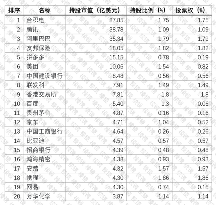 2023年12月31日,GPFG持仓市值前20名的中国股票(以美元计),持股比例指的是持有该上市公司全部股份的权益份额。来源:挪威央行投资管理机构,作者绘制。