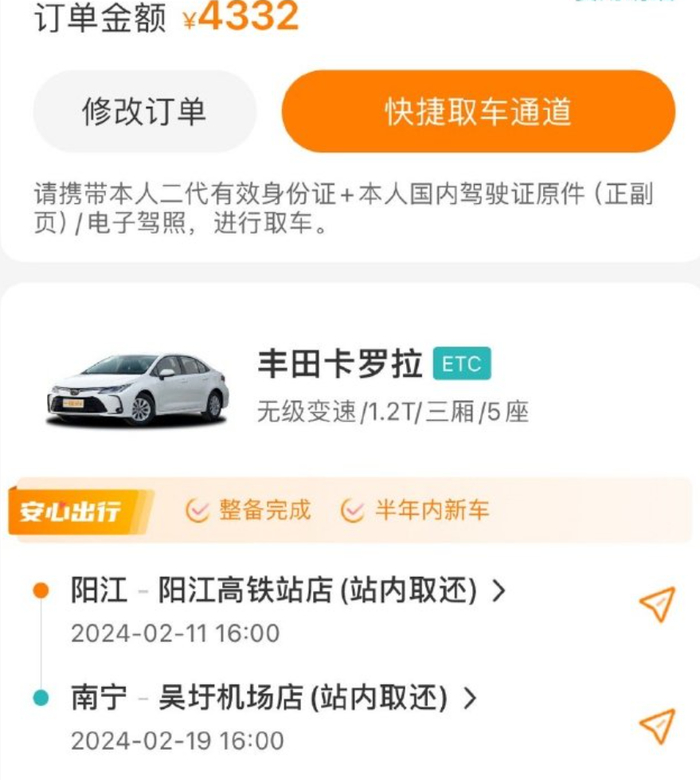 2.如果一开始就选择阳江取南宁还(异地还车)的话价格也会贵2000元,博格比较鸡贼,订车的时候选择阳江取还,然后再修改订单(+200元)南宁还车,这个小技巧就节约了1800元。(大家不要学习这种不良行为)