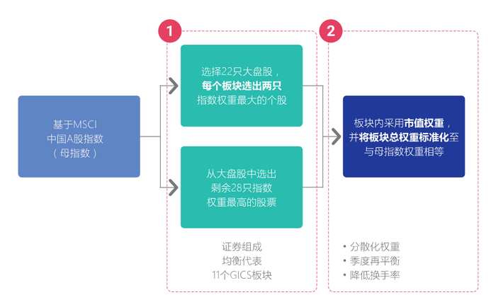 先从11个GICS(全球行业分类体系)一级行业中选出市值最大的2只股票,再依据排名在剩余范围内补充28只自由流通市值最大的股票,最后再选15只备用,旨在降低指数的换手率,并增加稳定性。