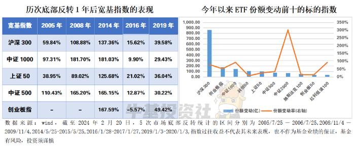 目前万得全A市盈率为15.80倍,处于近5年1.98%的分位数,这意味着市场已计入较为悲观的预期。从历史经验来看,宽基往往是逆势布局较好的工具。买宽基,就是选择模糊的正确。自2024年以来,从ETF份额变动前十的标的指数看,“买宽基”也是市场的共识选择