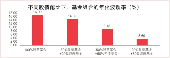 适当配置纯债基金1有助于降低组合整体波动性。得益于债券资产波动率相对较低,且与其他资产的相关性相对较小的优势,在组合中适当配置纯债基金,有助于降低组合波动率,分散投资风险,尤其市场波动时,可能帮助投资者在一定程度上改善持有体验。以过去五年为例,如构建股票基金和纯债基金的投资组合,可以发现随着组合中纯债基金比例增加,组合年化波动率明显下降。
