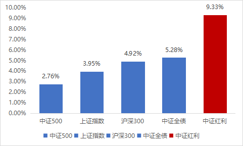 红利资产不仅存在防御属性,与有一定的“抗震”属性的债券资产相比,红利资产的年化收益也同样具备吸引力,近十年中证全债年化收益率为5.28%,中证红利指数的年化收益高达9.33%,满足了大家在拥抱确定性的同时适当增厚收益的需求。