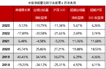 中信保诚量化阿尔法A(004716)成立于2017年7月12日,目前的业绩比较基准为沪深300指数收益率*95%+银行活期存款利率(税后)*5%。其近五年净值增长率/业绩比较基准增长率分别为, 2018:-19.20%/-24.12%,2019:40.43%/34.14%,2020:45.74%/25.86%,2021:6.48%/-4.85%,2022:-17.89%/-20.58%,2023:-5.12%/-10.79%。中信保诚量化阿尔法2021年4月20日新增C类份额,2021.4.20-2021.12.31:5.16%/ -2.69%; 2022:-18.22%/ -20.58%; 2023:-5.50%/ -10.79%。基金管理人对本基金的风险等级评级为R3。2017-07-12至2019-09-11:提云涛 杨旭2019-09-12至2022-03-23:提云涛2022-03-24至今:提云涛 王颖