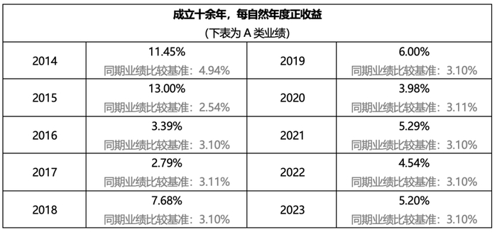 数据来源:基金定期报告。C类成立以来自然年度净值增长率为:2014年10.99%,2015年12.54%,2016年2.98%,2017年2.37%,2018年7.21%,2019年5.57%,2020年3.57%,2021年4.87%,2022年4.11%,2023年4.79%。