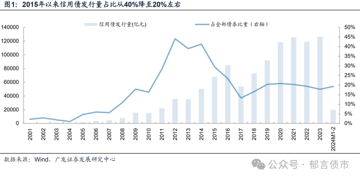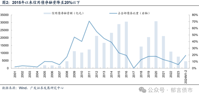 回望过去二十年,伴随着国内经济发展模式的转变,信用债市场经历了信用风险逐渐加大,再到出清下降的过程,风险主体已经或正在退出债券市场,对应信用债供给占比也逐步回落趋稳。当前,我们坚持发展新质生产力,传统行业的信用债发债主体或很难再像2008-2014年那样,重回大规模新增融资的时代,债市正在等待新生供给力量。