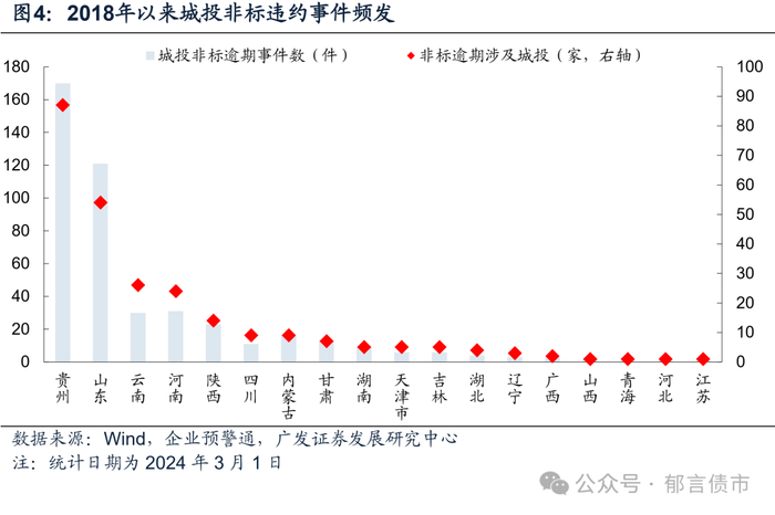 此外,2018年以来城投债务风险也开始逐步释放,虽然城投债券没有发生实质性违约,但也有过技术性违约,并且城投非标违约事件频发。具体来看,2018年以来,已有多家城投发生债券技术性违约,都属于区域经济财政实力和金融资源偏弱、债务管控能力不强的区域。另外,2018年至2023年3月1日,共发生了451件城投非标违约事件,涉及258家城投平台,大多位于贵州省、云南省、广西、山东潍坊市、湖南湘潭市等债务规模高企,偏网红的区域,且违约城投多为区县级平台。