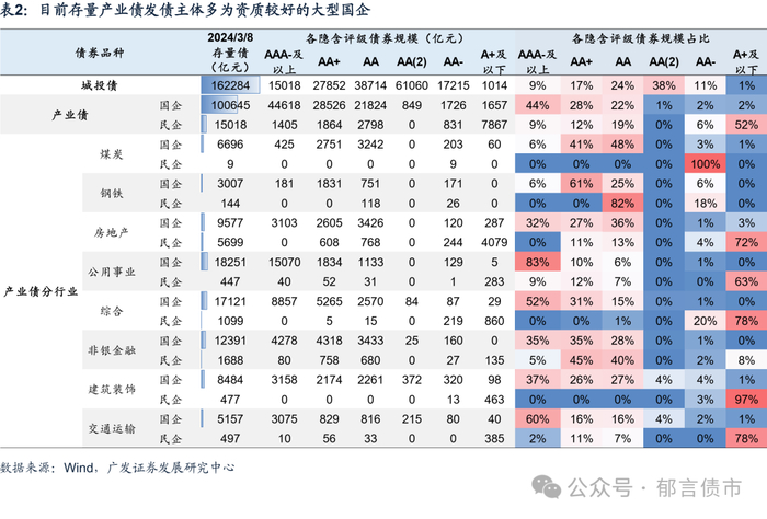 经过这几轮出清之后,目前存续的、有流动性的产业债基本上都是资质比较好的大型国企债,信用风险相对较小。截至2024年3月8日,产业债共计11.58万亿元,其中87%为国企债,并且这些国企产业债中约四分之三隐含评级在AA+及以上,即发行人多是资质比较好的大型国企。分行业来看,煤炭、钢铁、公用事业、综合、建筑装饰等行业国企存量债占比达到90%以上,房地产行业虽然民企存量债规模依然较大,但多数是已经债券违约或展期的主体,存量债已经基本没有流动性。在此背景下,截至2024年3月8日,剔除已违约或展期主体,89%的产业债收益率不到3%,其中50%收益率在2.5%以下。