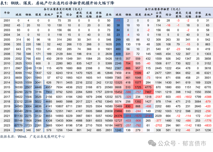 第一轮过剩产能行业违约潮过后,市场开始慎重判定钢铁债、煤炭债的信用风险,2016-2017年其净融资大幅转负。后续两年在供给侧改革、限产的推进下,钢铁和煤炭行业盈利能力修复,现金流改善,推动其一级市场情绪回温,但2020年以来继续出清。