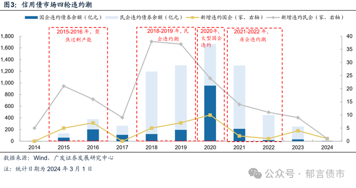 具体来看,2015年以来信用债市场大致经历了四轮违约潮。2014年3月“11超日债”无法按期支付利息,信用债“刚性兑付”时代宣告终结,正式开启中国信用债违约元年。第一轮违约潮是2015-2016年,违约主体多属于过剩产能行业,重灾区是钢铁和煤炭两个行业,比如桂有色、东特钢和川煤集团等。第二轮是2018-2019年的民企违约潮,违约原因除了经营问题,更多是由于金融去杠杆背景下部分资质偏低的民企融资困难,随着偿债高峰期的来临,最终导致发生流动性风险。