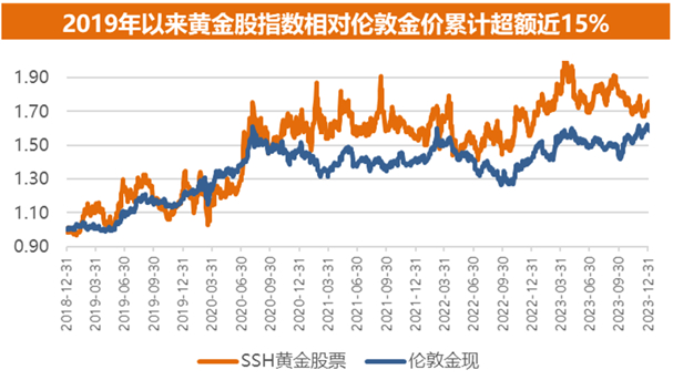黄金股持续跑赢黄金现货:黄金股指数相对伦敦金价超额显著,2019年以来黄金股指数累计超额近15%,6年平均年超额约2%,指数收益优势显著。