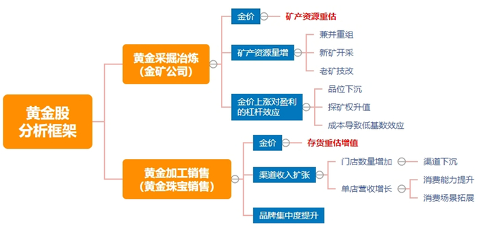 (2)消费品逻辑(黄金珠宝零售商):金价上涨带来金饰商品存货价值重估,存货量即为金价弹性系数;叠加消费品渠道扩张和品牌集中度提升逻辑,黄金股超额收益来源更加丰富。