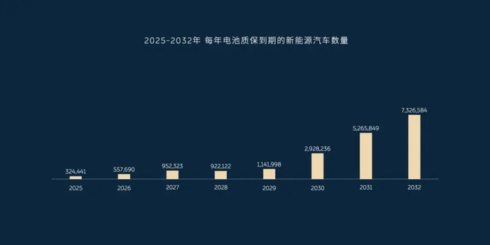 2025年,“脱保”电车将达到32万辆,2028年达到98万辆,而2032年将直接飙升至720万辆。也即,未来的8年时间内,我国动力电池质保到期的产品将累计突破千万级,逼近2000万辆。
