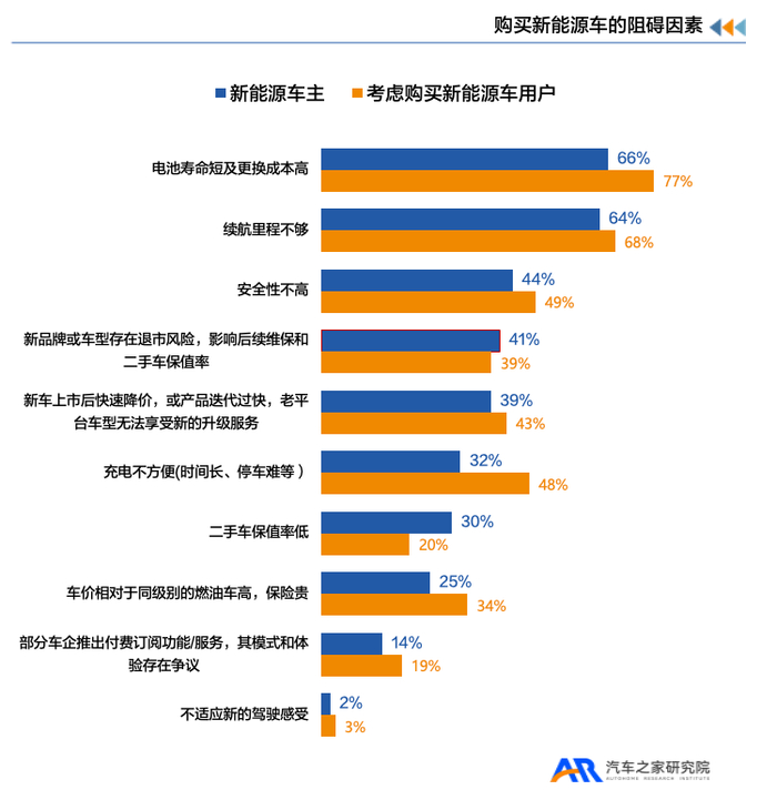 按照汽车之家研究院的《2024年新能源汽车用户用车焦虑洞察报告》的调查数据,当下阻碍消费者购买新能源的主要因素有三:电池未来的更换成本高、续航里程不足以及对安全性能的疑虑。