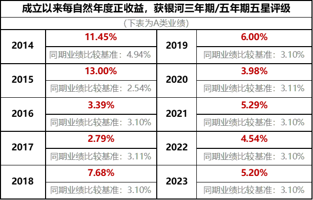 数据来源:iFind&基金定期报告。评级及排名来源:银河证券,净值计算截止日期2024/3/1,评价时间2024/3/1,A类近3年排名13/394,近5年排名9/203,C类近3年排名7/64,近5年排名5/37;A/C类均为三年期、五年期五星评级,A类分类为:债券基金-纯债债券型基金-定开纯债债券型基金(A类),C类分类为:债券基金-纯债债券型基金-定开纯债债券型基金(非A类)。