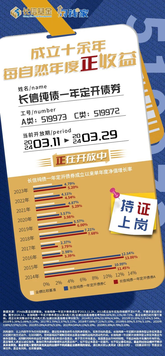 长信纯债一年定开债券正在开放中!当前第十个开放期为2024年3月11日起至2024年3月29日,开放期内接受申购、赎回业务申请,之后就要进入下一个封闭期啦。心动的小伙伴们一定要牢记开放期时间哦~