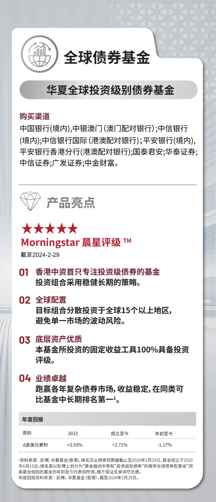 • 华夏全球投资级别债券基金(「本基金」)透过主要投资于全球市场上的投资级别的固定收益和债务工具,以向单位类别持有人提供长期资本增长。