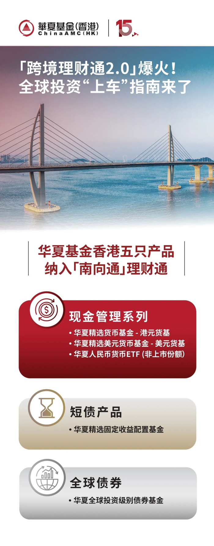 华夏基金(香港)作为香港顶尖的中资基金公司,是产品线最全面且多元的公司之一。目前,华夏基金(香港)有以下几只重点产品被纳入跨境理财通: