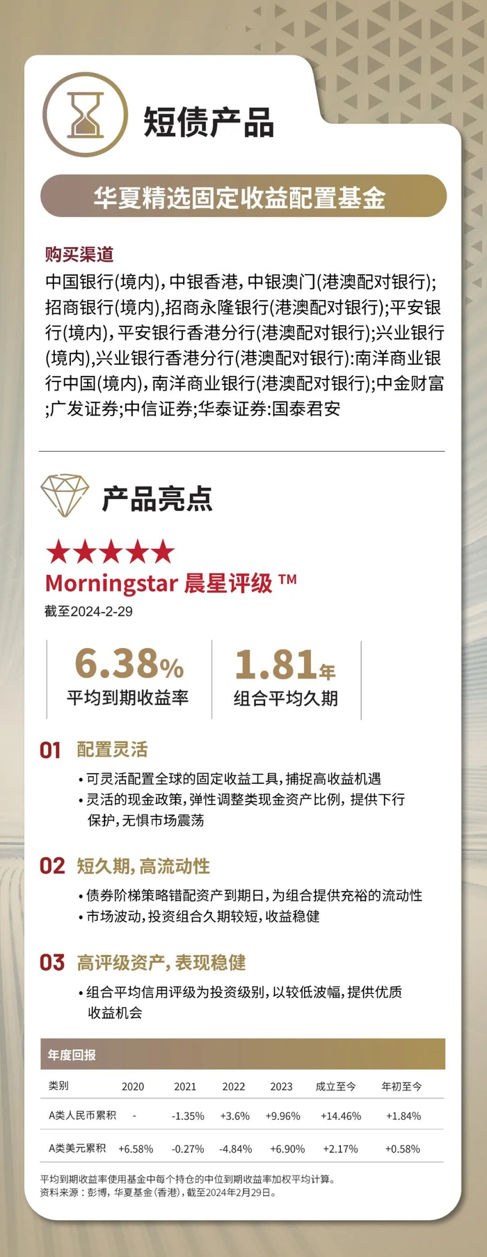 • 华夏精选美元货币基金(「本基金」)寻求将不少于其资产净值的70%投资于以美元计价和结算的短期存款、不同届满期的优质货币市场工具。