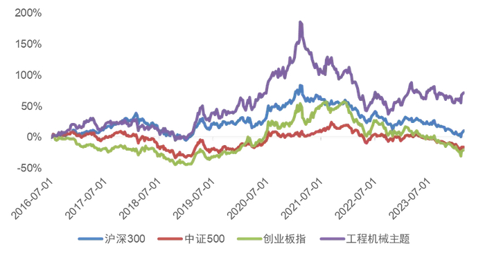 2016年6月30日至2024年2月22日,中证工程机械主题指数累计收益率为72.09%,年化收益率为7.58%,明显领先沪深300、中证500以及创业板指。